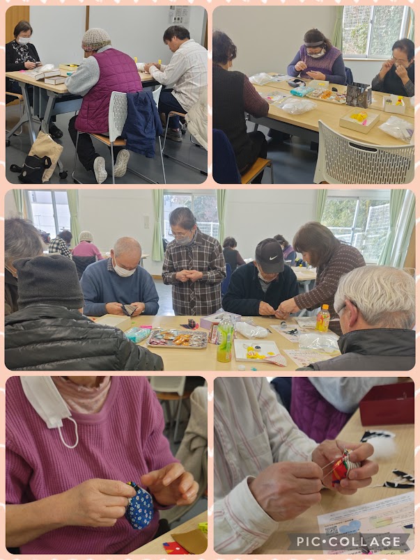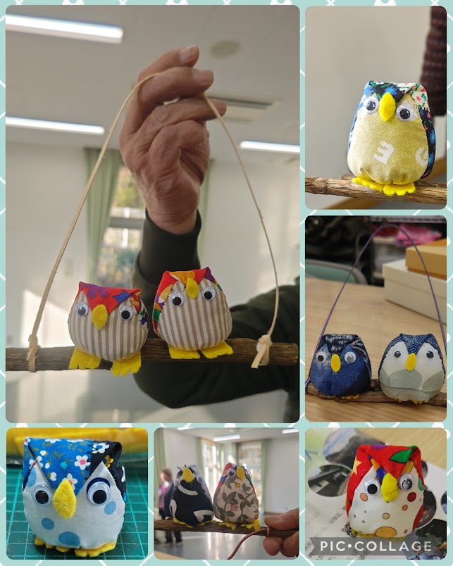 2月作成した作品、縁起を担いでフクロウ人形を南天の木にのせました。